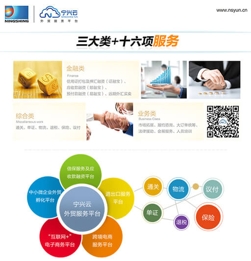 寧波寧興云外貿(mào)綜合服務(wù)平臺(tái)是浙江省及寧波市首批重點(diǎn)扶持外貿(mào)服務(wù)平臺(tái),依托寧興控股的綜合實(shí)力、良好信譽(yù)和完整的單證物流服務(wù)體系,利用先進(jìn)的“互聯(lián)網(wǎng)+”技術(shù),將外貿(mào)綜合服務(wù)與電子商務(wù)相結(jié)合,為中小外貿(mào)企業(yè)提供一站式、管家式、全程化的外貿(mào)綜合服務(wù)。公司還新拓展了跨境出口電商綜合服務(wù),融合B2B、B2C(跨境郵包出口)、B2B2C(跨境出口海外倉(cāng)模式)等服務(wù),是中國(guó)(寧波)跨境電商綜合實(shí)驗(yàn)區(qū)首家業(yè)務(wù)全線貫通的外貿(mào)綜合服務(wù)平臺(tái)。