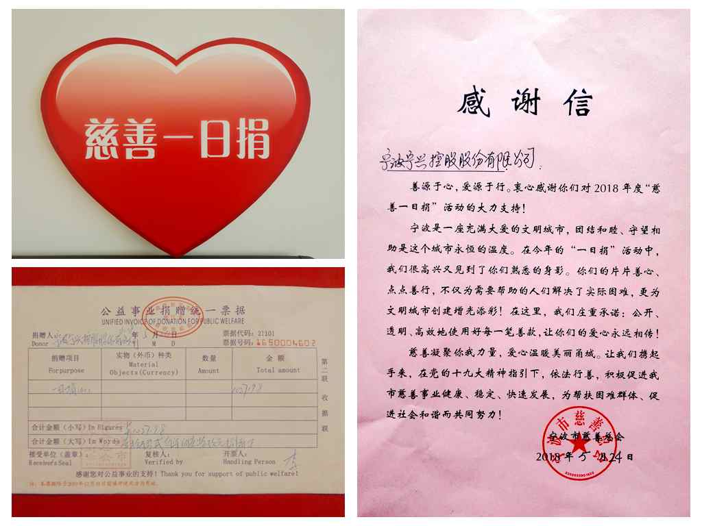 During the activity, the subsidiaries of Ningshing Holdings and all the company’s staff contributed the donation eagerly. The total donation reached the amount of more than 100 thousand RMB Yuan and was delivered to Ningbo Charity Federation.