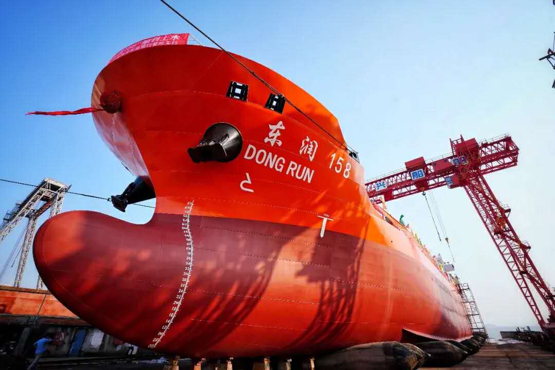 隨后,舟山寧興船舶總經(jīng)理衛(wèi)漢祥在船臺(tái)現(xiàn)場(chǎng)指揮整個(gè)接水工作。伴隨著禮炮聲、鳴笛聲,寧興船舶首制船“東潤(rùn)158”不銹鋼化學(xué)品船緩緩滑離船臺(tái),順利接水。