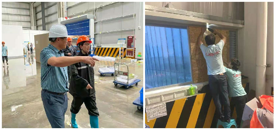 隨著“煙花”逐步逼近,寧興優(yōu)貝物流各倉庫不同程度進水,險情不斷,施偉總經(jīng)理沖鋒在前,連續(xù)幾天帶領(lǐng)員工戰(zhàn)斗在公司抗臺一線,果決排除各種險情。7月25日上午7點半,寧興優(yōu)貝物流玉山二號庫頂層?xùn)|西兩邊樓頂被瞬時大風(fēng)掀翻,分別產(chǎn)生長100多米、寬達1米左右的兩道破損口。玉山二號庫經(jīng)理王吉偉迅速組織人員展開自救,玉山一號庫經(jīng)理陳榮、維修班組組長趙枕波和其他倉員工也迅速趕到現(xiàn)場有序展開共同救援行動,倉庫后勤組黎紅梅、隋欣等及時組織食物發(fā)放給防汛抗臺人員補充體力…… 在持續(xù)30多個小時的作戰(zhàn)下,寧興優(yōu)貝物流全體員工齊心協(xié)力打贏防臺抗臺硬仗。期間,保稅區(qū)管委會副主任夏群、控股公司董事長吳以剛等心系優(yōu)貝物流,親臨倉庫現(xiàn)場,檢查指導(dǎo)抗臺與復(fù)工情況,慰問一線防臺人員。