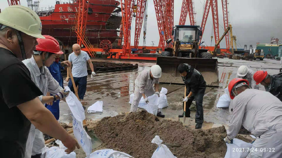 Under the leadership and command of Vice President Wang Wentong, more than 190 employees were transferred, more than 60 large equipment such as ships, plank houses and gantry cranes were reinforced. On the evening of July 24th, there was heavy wind and rain, the sea waves were turbulent, and the highest flood was 50cm higher than the shipyard ground. The company's emergency management team immediately ordered to cut off all power supply in the plant area, arranged all rescue personnel to withdraw to the safe area, and transferred all accommodation personnel in the former plant area after the tide receded to ensure personal safety. With everyone's concerted efforts, the company finally resisted the attack of wave.