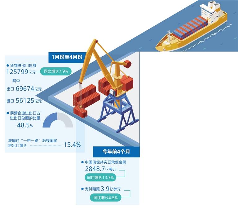 今年3月份以來,國內(nèi)新冠肺炎疫情呈多點(diǎn)散發(fā)態(tài)勢,防控形勢依舊嚴(yán)峻,相關(guān)部門不斷出臺(tái)政策全力保障外貿(mào)企業(yè)開展經(jīng)營。5月5日召開的國務(wù)院常務(wù)會(huì)議提出,要加大外貿(mào)企業(yè)信貸投放,支持銀行不盲目抽貸、斷貸、壓貸,梳理一批亟需資金的予以重點(diǎn)支持;擴(kuò)大出口信保短期險(xiǎn)規(guī)模;保持人民幣匯率基本穩(wěn)定。最新統(tǒng)計(jì)數(shù)據(jù)顯示,1月份至4月份,貨物進(jìn)出口總額125799億元,同比增長7.9%。其中,出口69674億元,增長10.3%;進(jìn)口56125億元,增長5.0%。民營企業(yè)進(jìn)出口占進(jìn)出口總額的比重為48.5%,比上年同期提高1.4個(gè)百分點(diǎn)。我國對“一帶一路”沿線國家進(jìn)出口增長15.4%,其中出口增長12.9%,進(jìn)口增長18.6%。