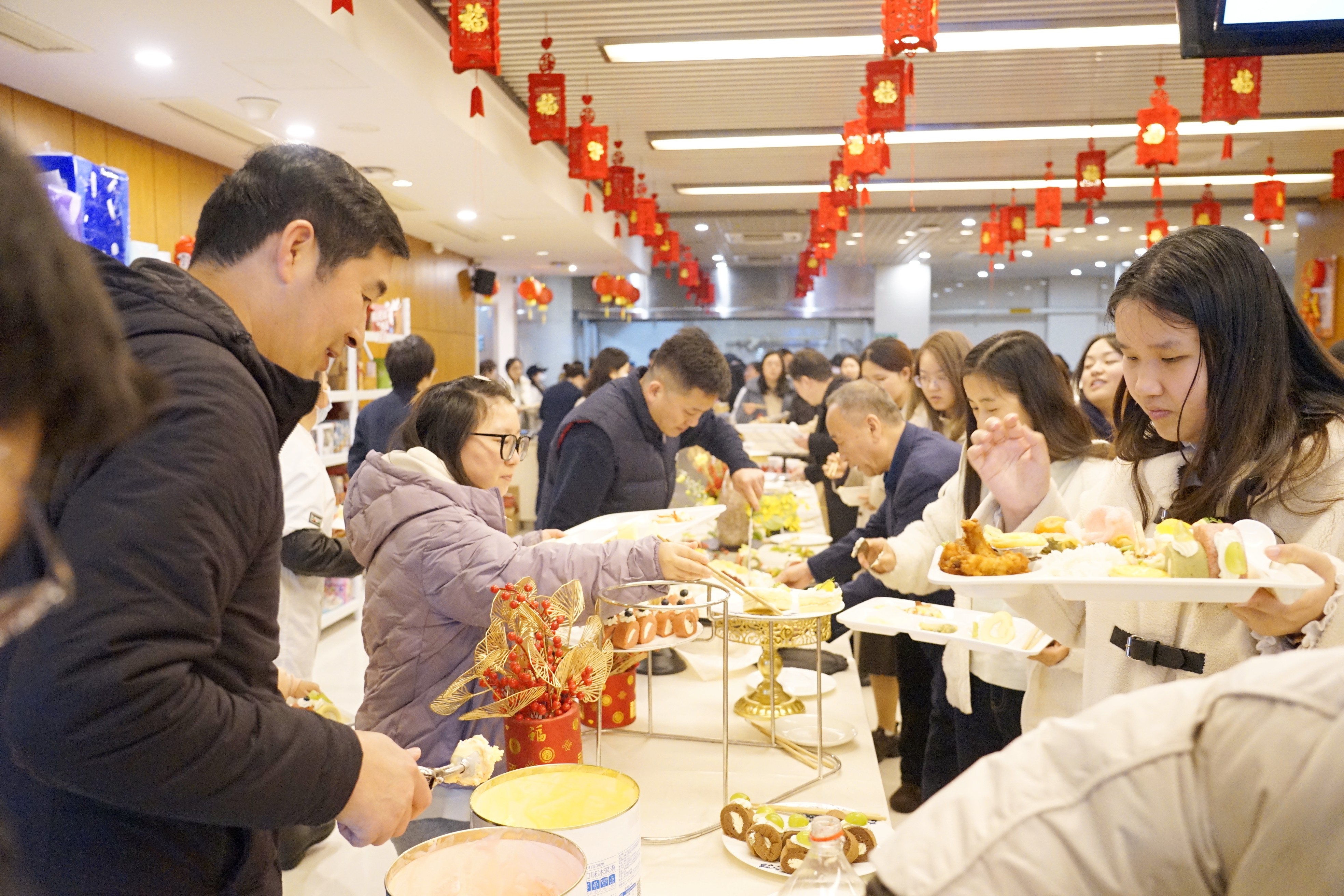 食堂內(nèi)佳肴美食琳瑯滿目。既有熱氣騰騰的各類小炒、鮮嫩多汁的熱氣海鮮、手工制作的熱湯面、軟糯的彩色湯圓,還有清新爽口的沙拉、細(xì)膩綿軟的蛋糕和甜蜜誘人的冰激凌。員工們圍坐一起,邊品嘗美食邊分享新年的故事,更感受著來自寧興大家庭的幸福關(guān)懷。