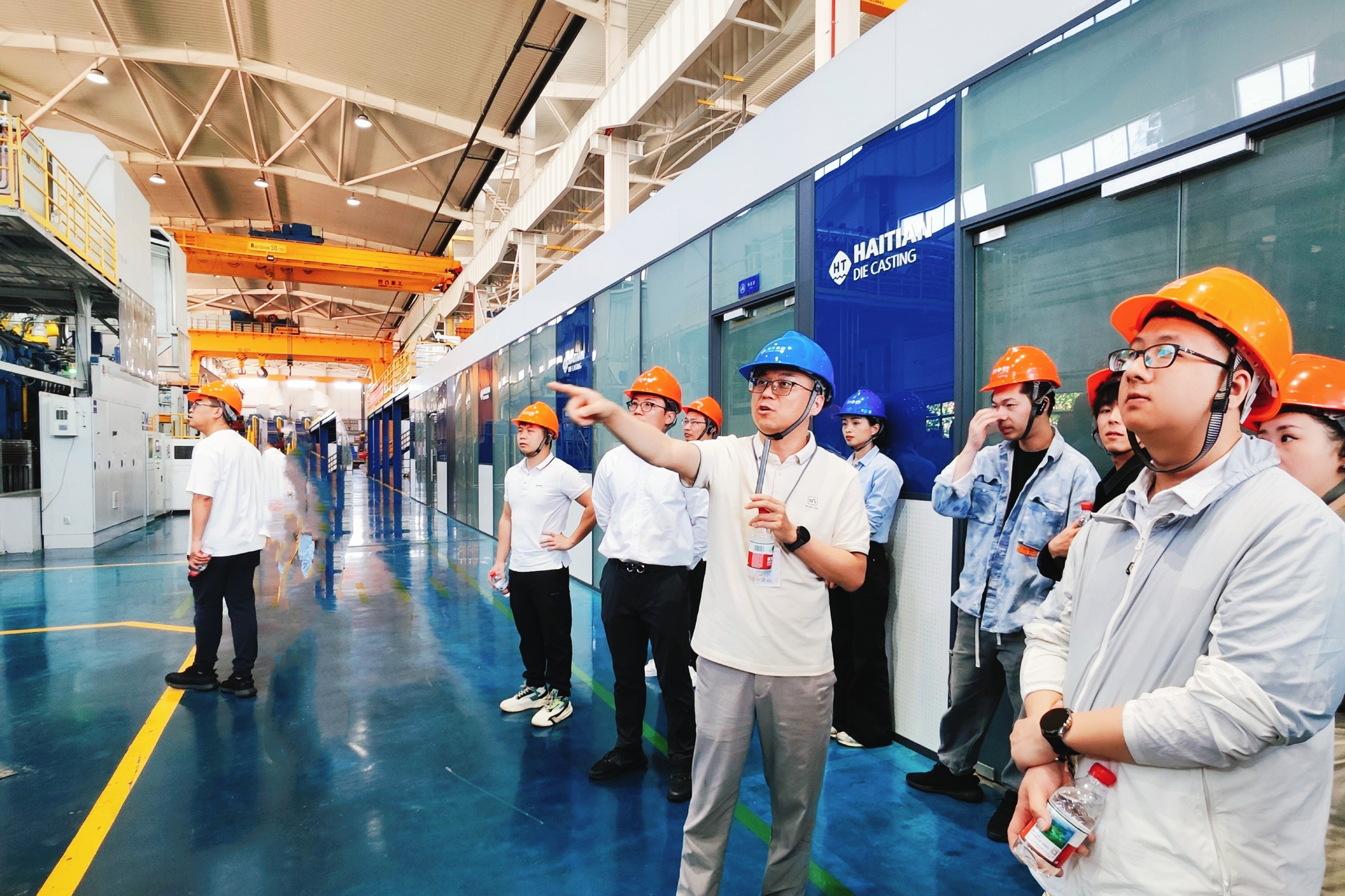 參觀第一站是海天集團(tuán)旗下海天智勝金屬有限公司,大家現(xiàn)場(chǎng)觀摩了海天大型、超大型鋁合金壓鑄設(shè)備,高級(jí)工程師李工詳細(xì)講解了設(shè)備結(jié)構(gòu)原理、核心技術(shù)及產(chǎn)品應(yīng)用。鎂合金壓鑄項(xiàng)目技術(shù)負(fù)責(zé)人則向大家展示了國產(chǎn)化突破成果,海天鎂合金壓鑄機(jī)持續(xù)攻關(guān),打破日本技術(shù)壟斷,全球市占率已達(dá)40%。青年員工們對(duì)現(xiàn)場(chǎng)的超大壓鑄設(shè)備深感震撼,紛紛贊嘆海天在先進(jìn)技術(shù)領(lǐng)域的持續(xù)探索與高效轉(zhuǎn)化。