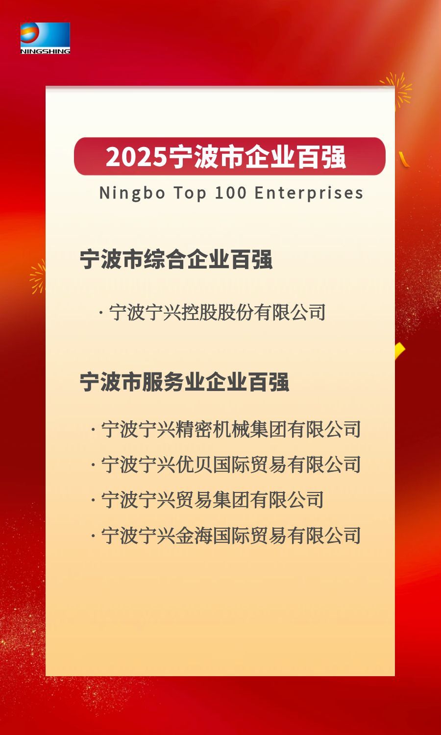 寧興控股繼續(xù)入選“2025寧波市綜合企業(yè)百強”;寧興控股所屬寧興精密機械集團、寧興優(yōu)貝、寧興貿(mào)易集團、寧興金海同時入選“2025寧波市服務(wù)業(yè)企業(yè)百強”。