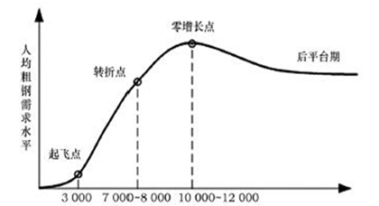 由于不同國家和地區(qū)經濟發(fā)展模式不同,鋼鐵消費峰值期的時間跨度、人均粗鋼消費量水平以及后平臺期消費趨勢的演化等呈現(xiàn)不同的特點。發(fā)達國家的發(fā)展經驗表明,鋼鐵需求與經濟發(fā)展呈正相關的關系,當人均GDP達到3000美元時,人均粗鋼消費高速增長;當人均GDP達到7000美元-8000美元時,人均粗鋼消費強度達到峰值;當人均GDP超過10000美元時,鋼鐵消費到達頂點并進入后平臺期。