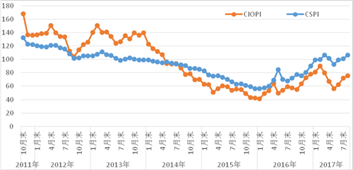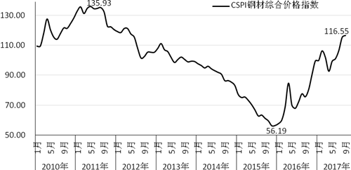 從2011年下半年以來,國內市場鋼材價格經歷了長達四年半的持續(xù)下跌,中國鋼材價格指數(shù)(CSPI)從2011年5月末的135.93點,降至2015年11月末的56.19點,累計下跌79.74點;從2015年12月末至2017年9月末呈波動上行走勢,由56.19點升至116.55點,累計上升60.36點;2017年1-8月,鋼材價格平均指數(shù)為102.83點,預計全年將達到106.99點。從大品種情況看,長材漲跌幅度高于板帶材約5個百分點。
