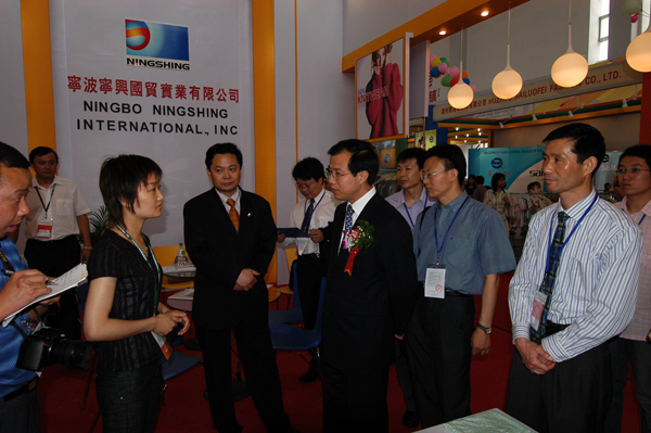 6月8日,在第四屆中國國際消費(fèi)品博覽會開幕當(dāng)天,國家商務(wù)部部長助理傅自應(yīng)在市外經(jīng)貿(mào)局領(lǐng)導(dǎo)的陪同下,視察了我司控股的寧波寧興國貿(mào)實(shí)業(yè)有限公司的服裝攤位,詳細(xì)詢問并了解了寧興國貿(mào)服裝產(chǎn)品的出口狀況,以及歐美紡織品貿(mào)易保護(hù)對出口企業(yè)造成的影響,并對寧興國貿(mào)展位的特裝設(shè)計給予了贊揚(yáng)。