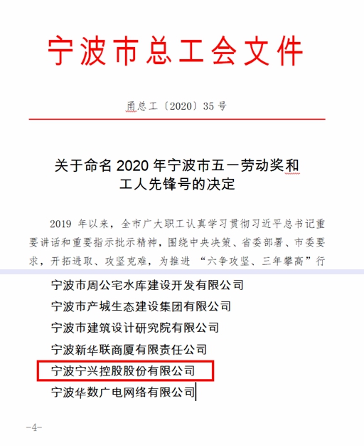 熱烈祝賀寧興控股榮獲“寧波市五一勞動獎狀”2020-05-08